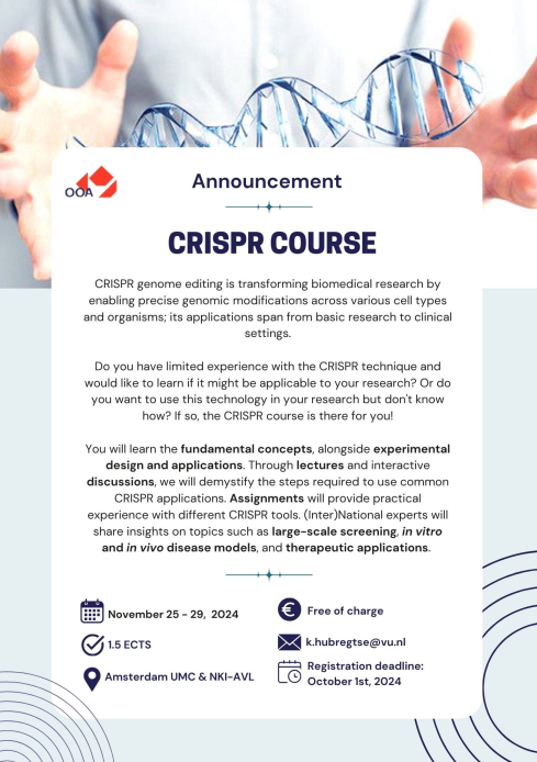I’m pleased to inform you that the Oncology Graduate School Amsterdam (OOA) is organizing a CRISPR course, and as part of our new collaboration with the OOA, ONWAR members are invited to participate at no cost.