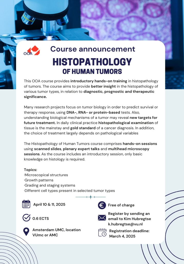 We are excited to share that the Graduate School of Oncology has offered our network two complimentary spots for their upcoming course on the "Histopathology of Human Tumors." This course may be particularly relevant for those of you whose current research or future career plans align with its content.