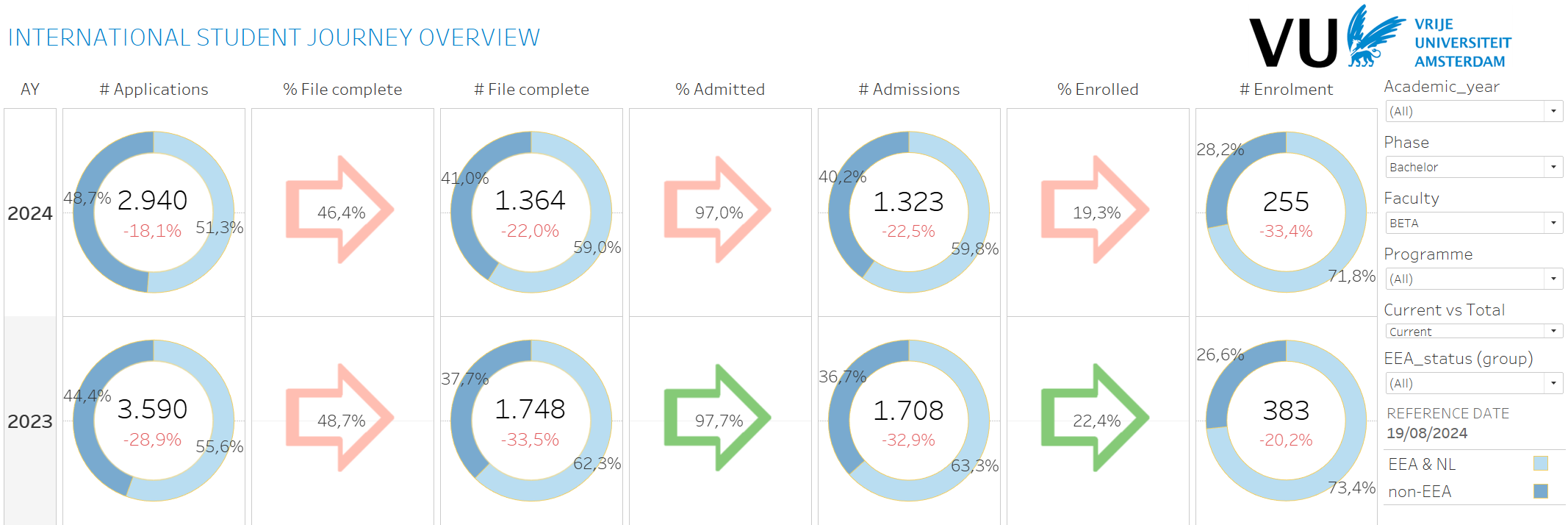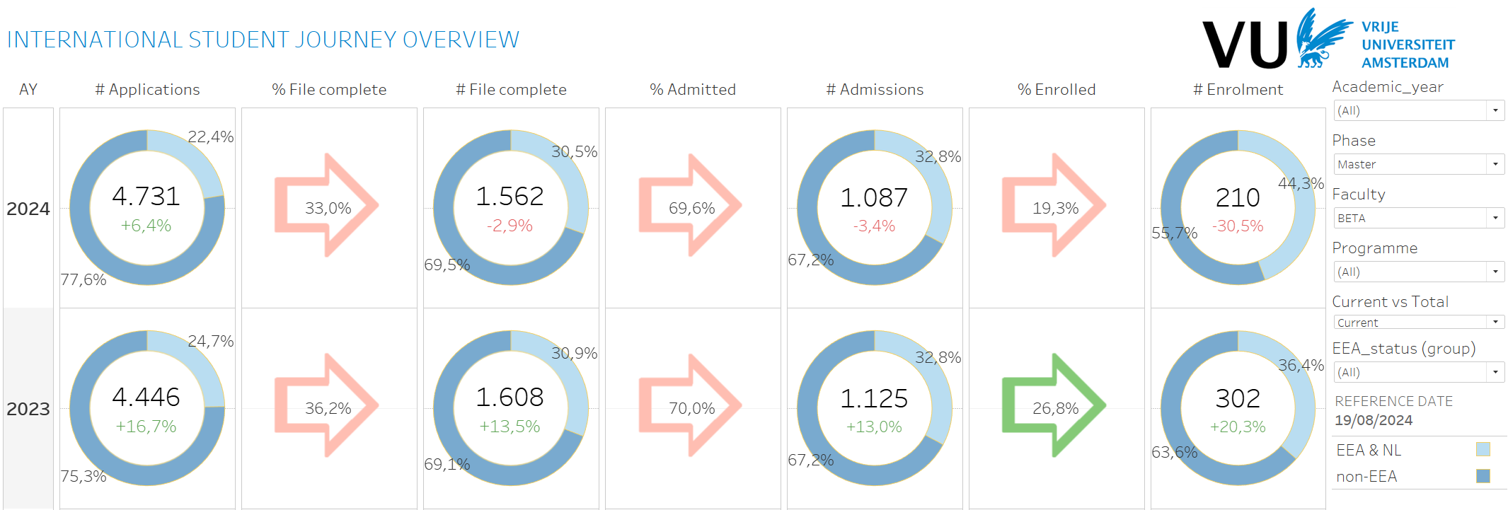 For the Bachelors, it can be seen that enrollments are currently 33.4% behind last year, this while there were “only” 18.1% fewer applications in studielink. This difference is caused by the conversion between the different steps in the student journey, which has decreased slightly at each step compared to last year. Currently, the conversion from admission to enrollment in particular lags behind. As mentioned earlier, a decrease the international Bachelor enrollment at Beta of ~23% was expected.